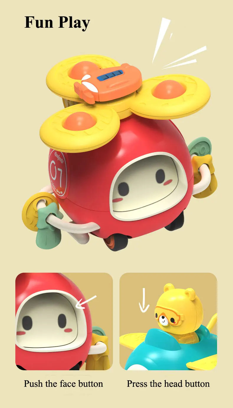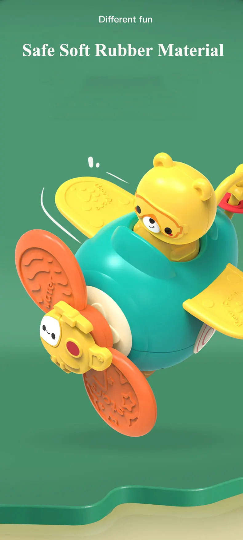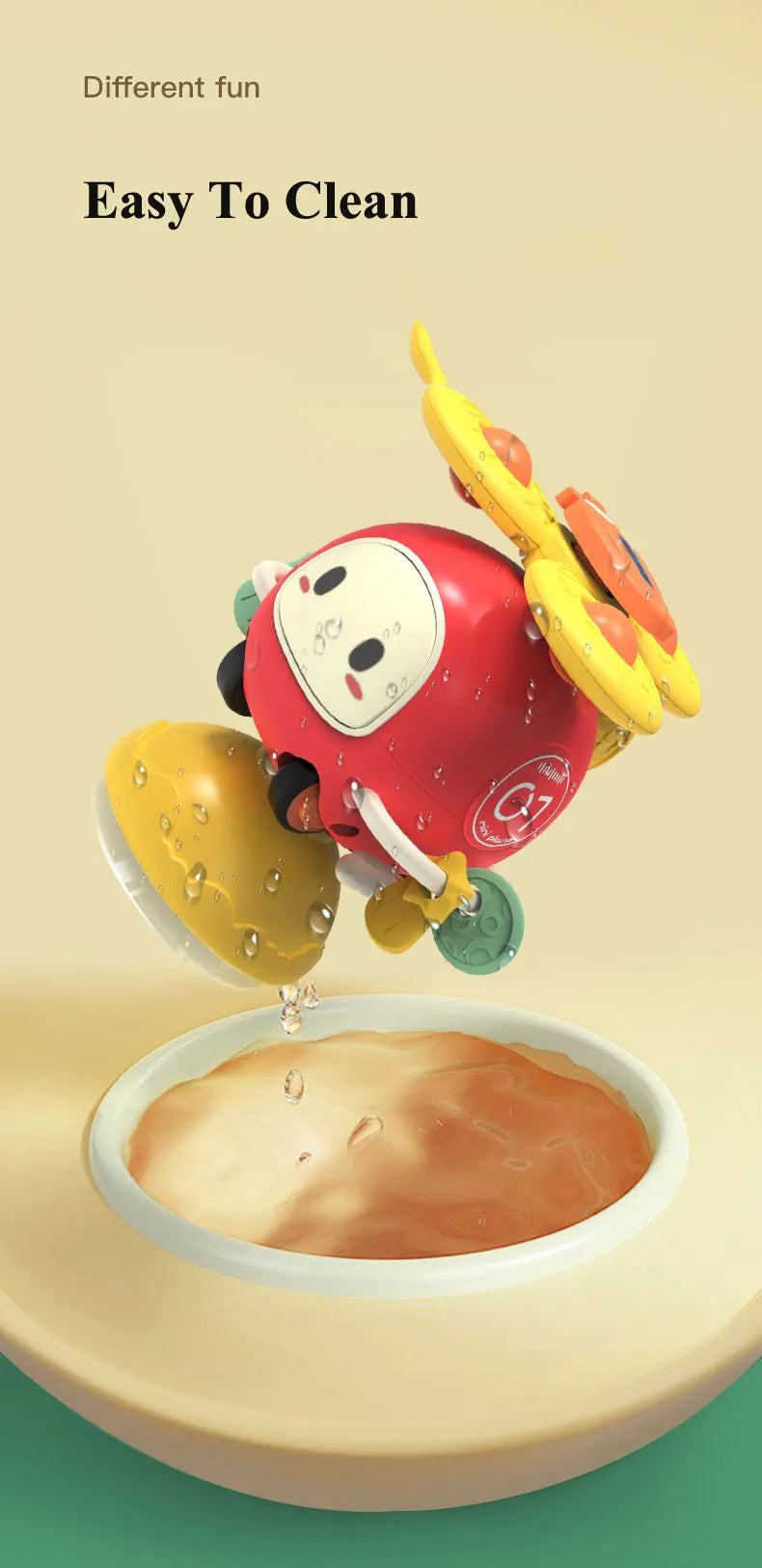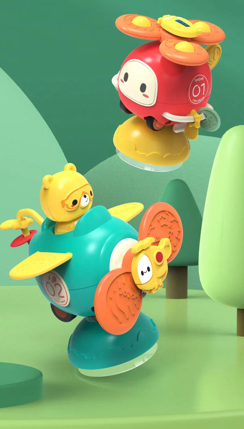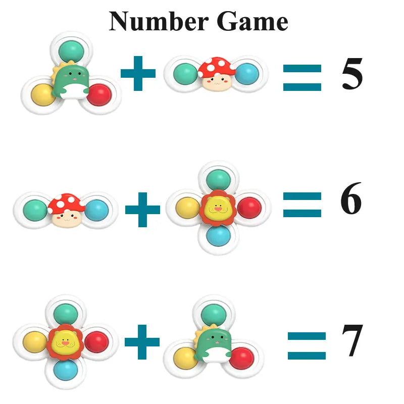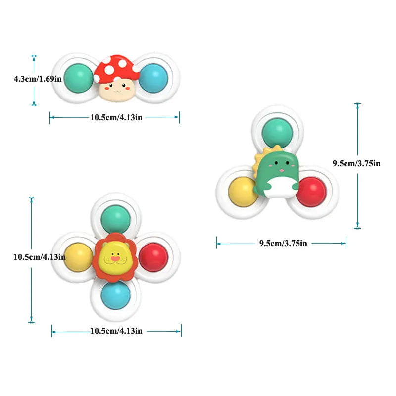 Vrolijke zuignap spinners die je vastklikt op badwand, tegels, raam of eetblad. Een tikje en ze draaien vlot rond—goed voor fijne motoriek, oorzaak-gevolg en lange speelmomenten in bad of aan tafel.